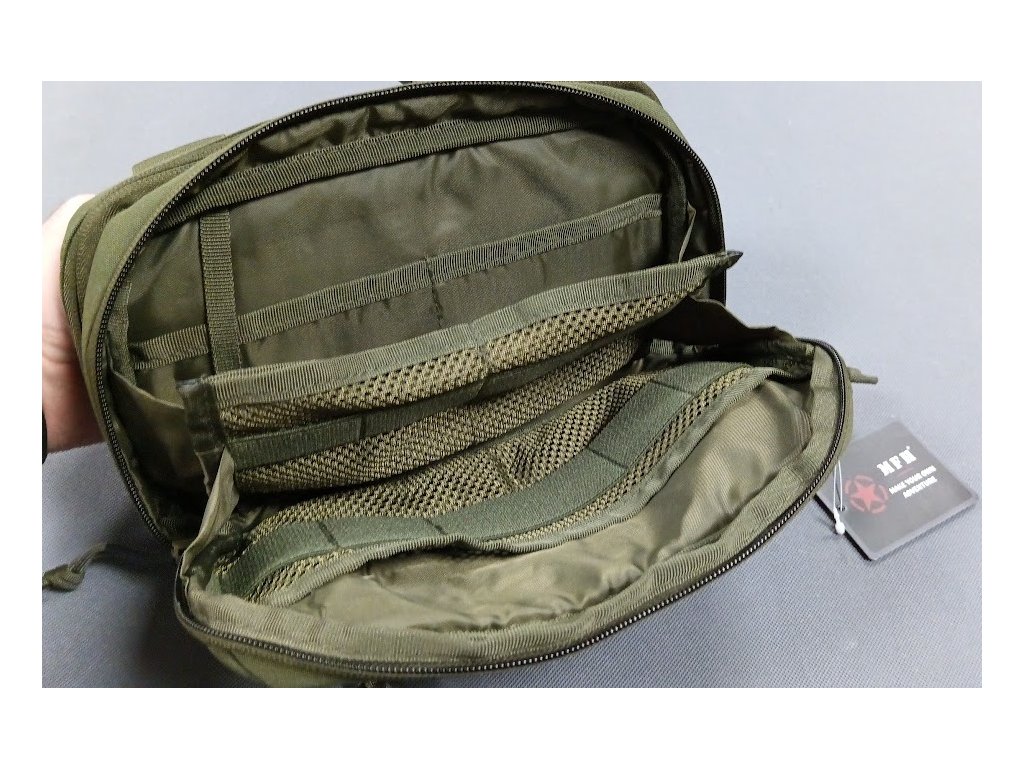 - Přední strana s kapsou na zip a nasouvací kapsou se suchým zipem a poutky Molle na vnější straně