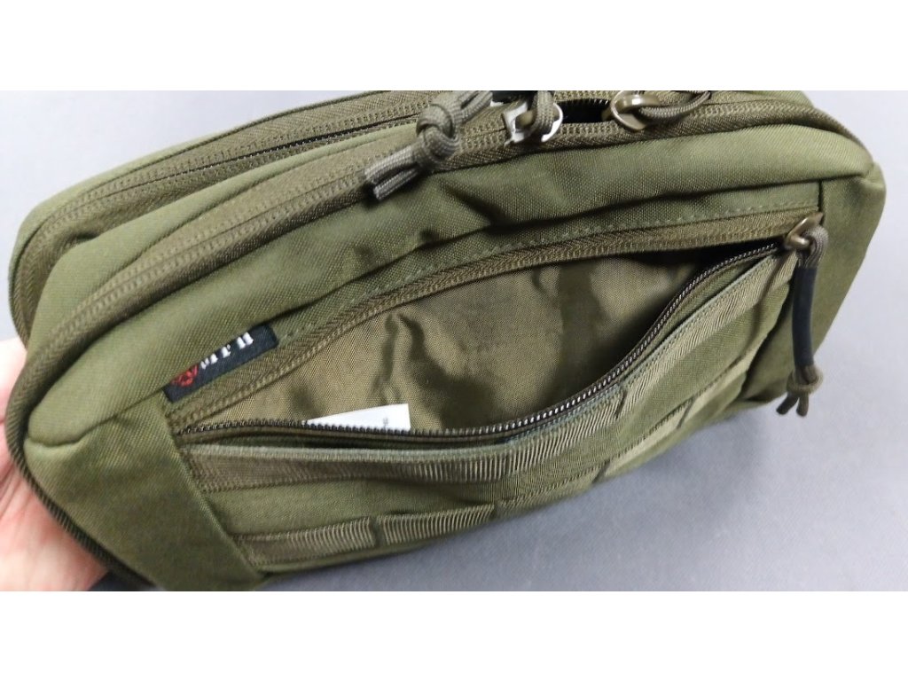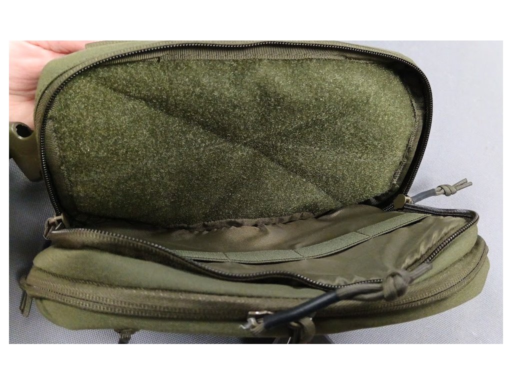 - Přední strana s kapsou na zip a nasouvací kapsou se suchým zipem a poutky Molle na vnější straně