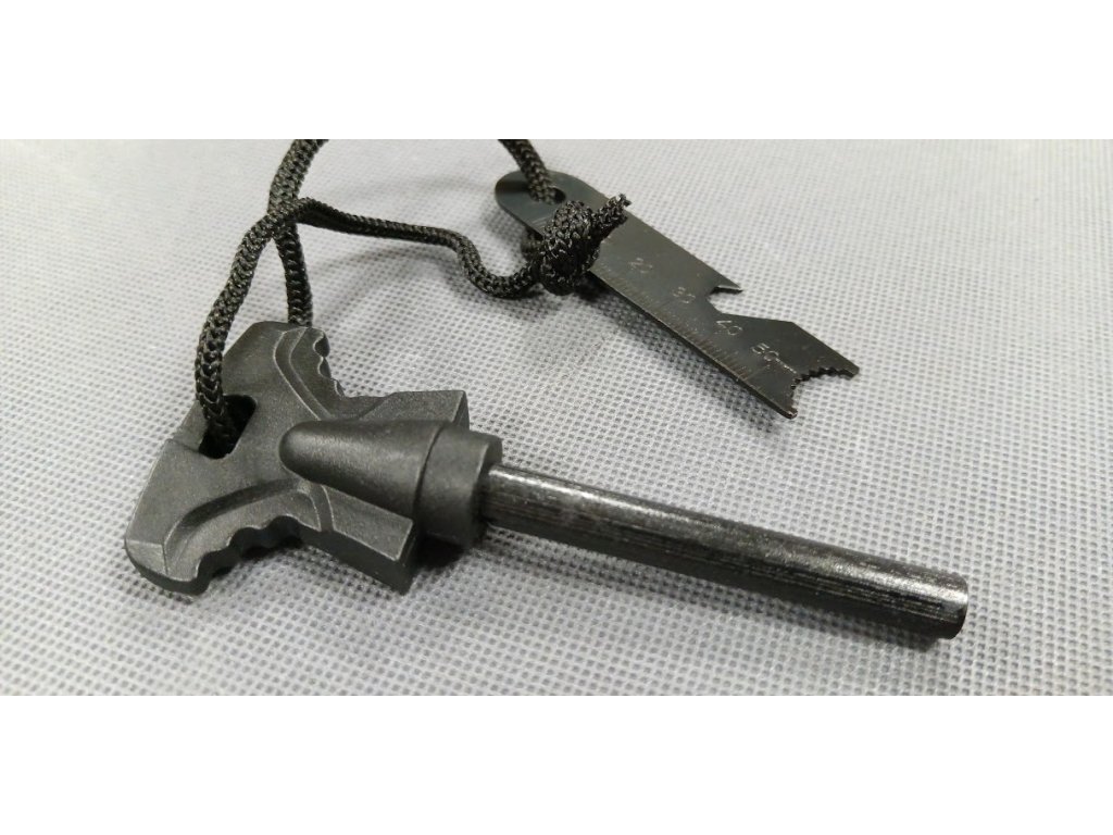 - ocelová tyčinka z hořčíkové slitiny s plastovým držákem a křesacím plíškem na nylonovém provázku